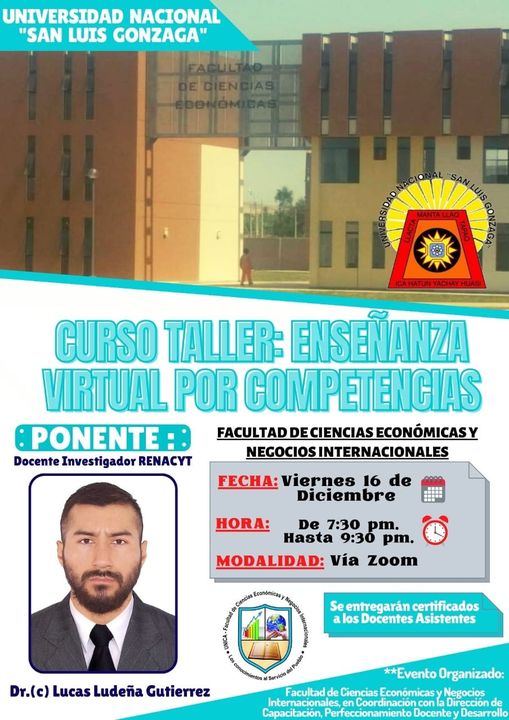 #Capacitación | El departamento académico de la facultad de Ciencias Económicas y Negocios Internacionales de la Universidad Nacional «San Luis Gonzaga», tiene a bien invitarlos a participar del curso taller: ENSEÑANZA VIRTUAL POR COMPETENCIAS a llevarse a cabo el día VIERNES 16 de diciembre a horas 7:30 p.m., dirigido a docentes de la facultad de Ciencias Económicas y Negocios Internacionales de la U.N.ICA. a cargo del expositor Dr. LUCAS LUDEÑA GUTIERREZ.