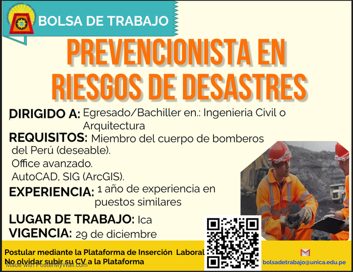 #BolsaDeTrabajo | Prevencionista en riesgos de desastres.