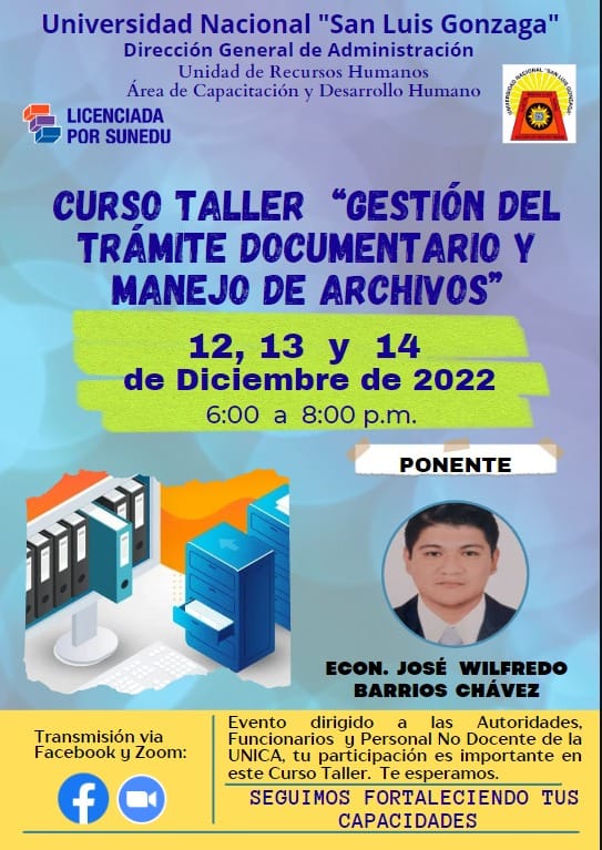 #Capacitación | CURSO TALLER “GESTIÓN DEL TRÁMITE DOCUMENTARIO Y MANEJO DE ARCHIVOS”, el cual está dirigido a autoridades, funcionarios y personal administrativo de todas las áreas de la Universidad Nacional «San Luis Gonzaga». Este evento inicia hoy 12, y continuará los dias 13 y 14 de diciembre del 2022, a horas de 6:00 a 8:00 p.m. (03 sesiones), la ponencia estará a cargo del Econ. JOSÉ WILFREDO BARRIOS CHÁVEZ.