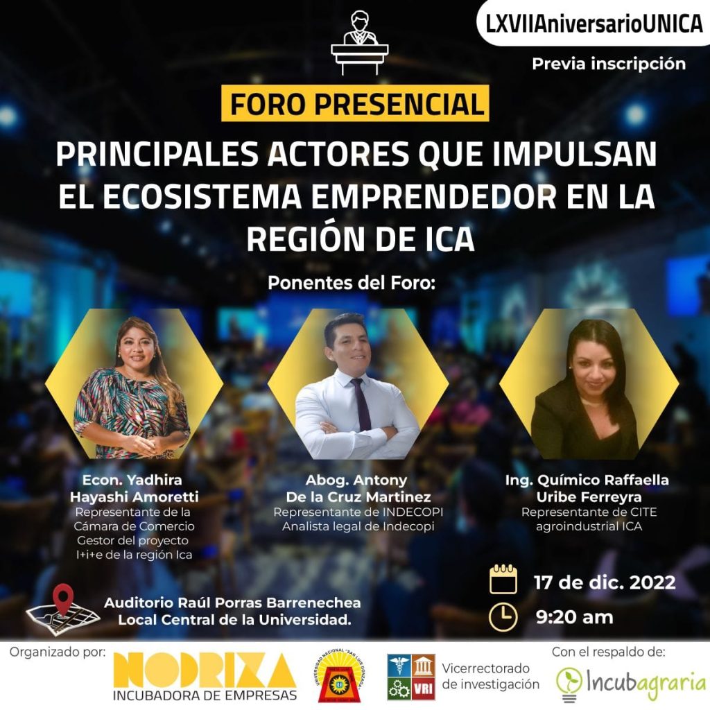 Foro presencial “Principales actores que impulsan el ecosistema emprendedor en la región Ica”, con la participación de destacados representantes de las principales instituciones de la región Ica.
