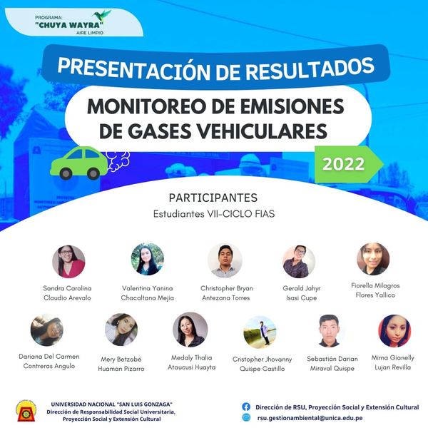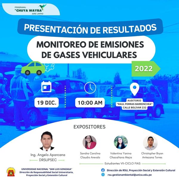 #RSU | La dirección de Responsabilidad Social Universitaria, Proyección Social y Extensión Cultural realizará la PRESENTACIÓN DE RESULTADOS DEL MONITOREO DE EMISIONES DE GASES VEHICULARES 2022 DEL PROGRAMA “CHUYA WAYRA”, con la ponencia del Ing. Angelo Aparcana Acuache y estudiantes de la facultad de Ingenieria Ambiental y Sanitaria de la Universidad Nacional «San Luis Gonzaga», quienes realizaron los trabajos de campo en puntos estratégicos y en coordinacion con los gobiernos locales.