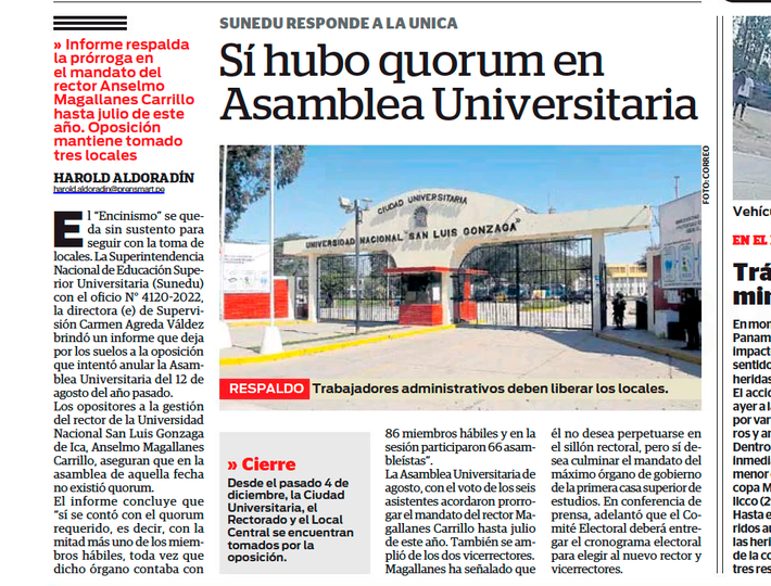 #DifusiónUNICA | La edición impresa del diario correo Ica titula: «Si hubo quórum en Asamblea Universitaria» informe de la Sunedu respalda prórroga en el mandato de autoridades.