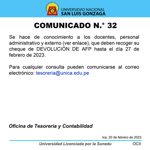 #Tesorería | Se hace de conocimiento a los docentes, personal administrativo y externo (ver enlace), que deben recoger su cheque de DEVOLUCIÓN DE AFP hasta el día 27 de febrero de 2023.