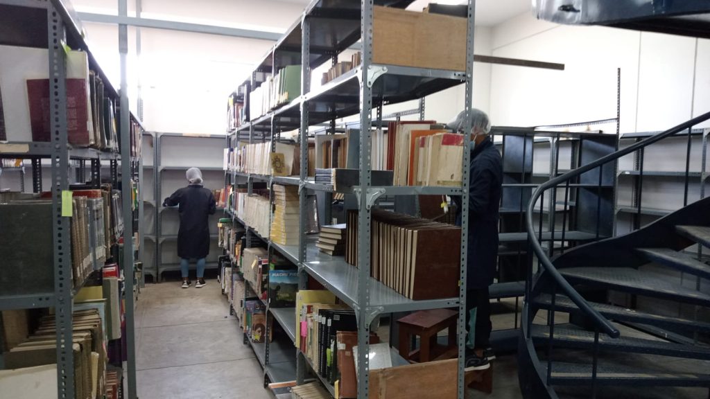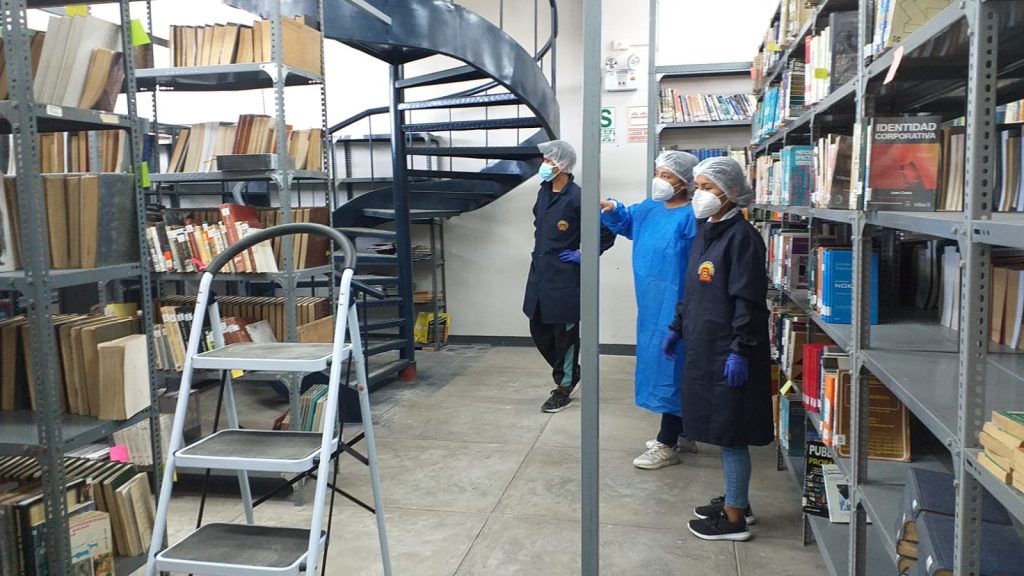 #ServiciosAcadémicos | Personal de la Dirección de Servicios Académicos está realizando la limpieza en la Biblioteca central, la cual consiste en el retiro de polvo de las estanterías donde se encuentra el material bibliográfico consistente en libros, revistas, entre otros. Para ello están provistos de mandiles, guantes, gorros y paños.