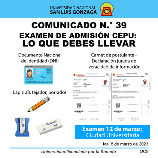 #CepuUnica | Este domingo 12 de marzo se realizará el examen de admisión del CEPU, ten en cuenta que sólo debes llevar tu DNI, carnet de postulante, lápiz 2b, borrador y tajador.
