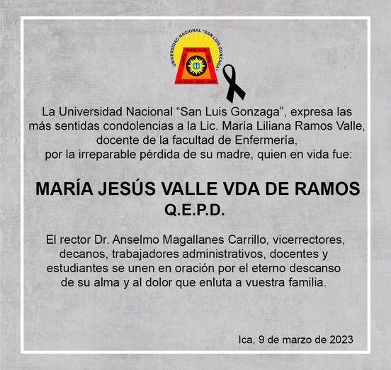 | La Universidad Nacional “San Luis Gonzaga”, expresa las más sentidas condolencias a la docente de la facultad de Enfermería Maria Liliana Ramos Valle, por la irreparable pérdida de su madre, quien en vida fue: María Jesús Valle Vda. de Ramos.