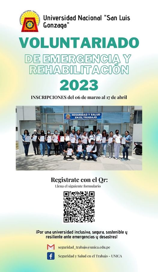 La oficina de Seguridad y Salud en el Trabajo de la UNICA, invita a participar de la convocatoria para el Voluntariado de Emergencia y Rehabilitación 2023 ![]()
