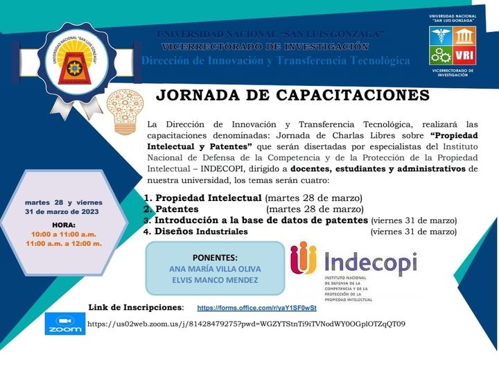 #VicerrectoradoInvestigación | El Vicerrectorado de Investigación a través de la Dirección de Innovación y Transferencia Tecnológica, realizará la jornada de charlas libres sobre «Propiedad intelectual y patentes».