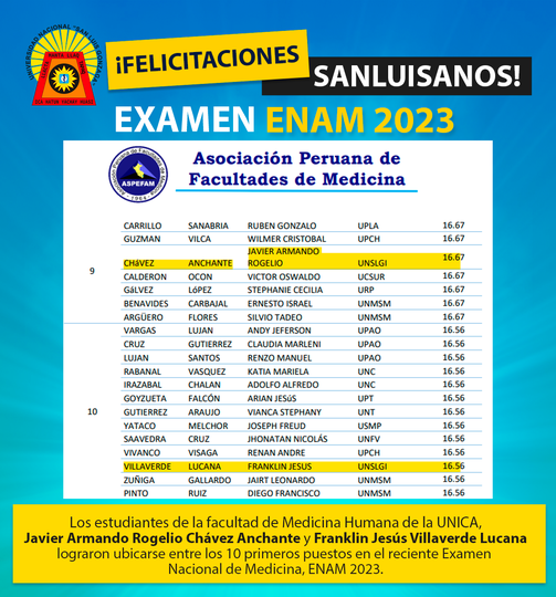 #MedicinaHumana | 隆Felicitaciones Sanluisanos! con mucho j煤bilo anunciamos que dos estudiantes de la facultad de Medicina Humana, lograron ubicarse entre los 10 primeros puestos en el reciente Examen Nacional de Medicina Humana, ENAM 2023.