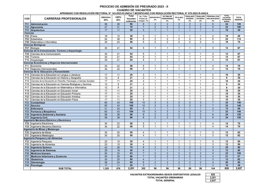 con Resolución Rectoral n.° 578-2023-R-UNICA, se resuelve incluir en el cuadro de vacantes para el proceso de admisión de pregrado 2023 (I y II) de la Universidad Nacional «San Luis Gonzaga», aprobrado mediante Resolución Rectoral n.° 143-2023-R-UNICA de fecha 16 de febrero de 2023, las vacantes para el programa de la facultad de Medicina Humana, quedando de acuerdo al anexo que forma parte de la presente resolución.