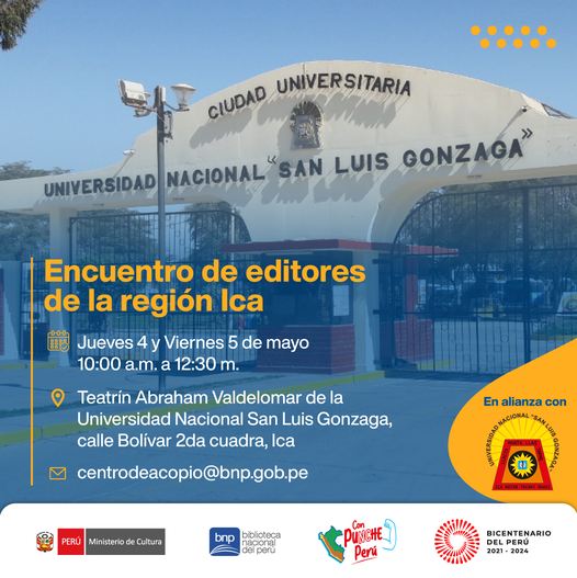 #Encuentro | La Universidad Nacional «San Luis Gonzaga» y la Biblioteca Nacional del Perú, invitan a participar del ENCUENTRO DE EDITORES DE LA REGIÓN ICA que se realizará los días 4 y 5 de mayo de 10:00 a.m. 12:00 m. en las instalaciones del Teatrín Abraham Valdelomar.
