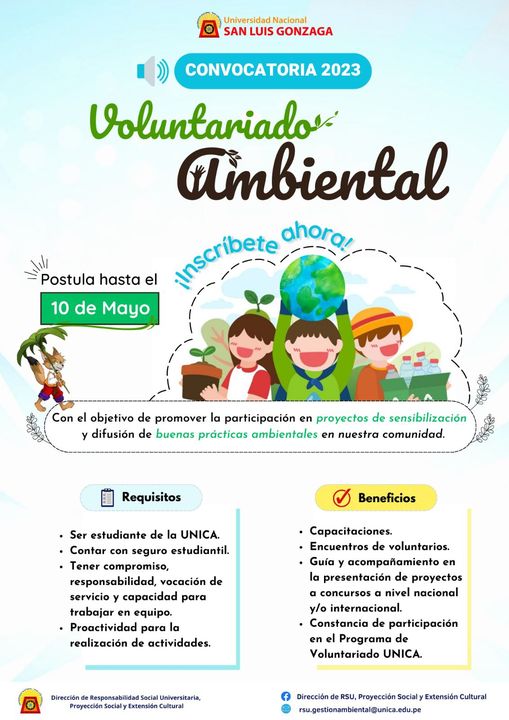 El Área de Gestión Ambiental de la Dirección de RSU, Proyección Social y Extensión Cultural invita a la comunidad universitaria a inscribirse y pertenecer al Voluntariado Ambiental Universitario para formar parte de los proyectos de sensibilización y difusión de buenas prácticas ambientales en nuestra Universidad Nacional «San Luis Gonzaga»