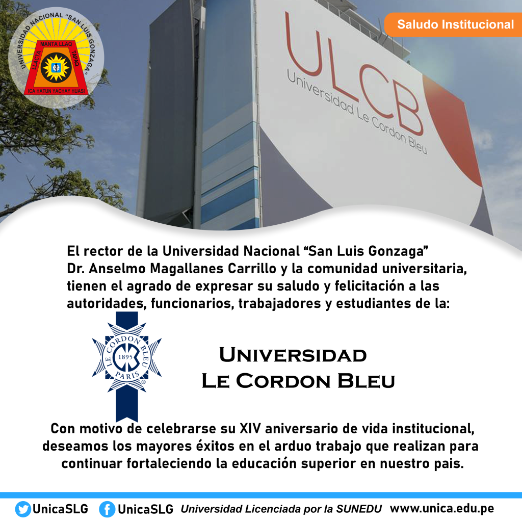 SaludosInstitucionales | El rector de la Universidad Nacional “San Luis Gonzaga” Dr. Anselmo Magallanes Carrillo y la comunidad universitaria, tienen el agrado de expresar su saludo y felicitación a las autoridades, funcionarios, trabajadores y estudiantes de la Universidad Le Cordon Bleu con motivo de celebrarse sus catorce aniversario de vida institucional.