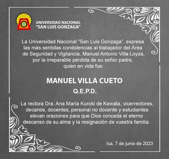 ☦️ CONDOLENCIAS ☦️ | La Universidad Nacional “San Luis Gonzaga”, expresa las más sentidas condolencias al trabajador del Área de Seguridad y Vigilancia, Manuel Antonio Villa Loyza,