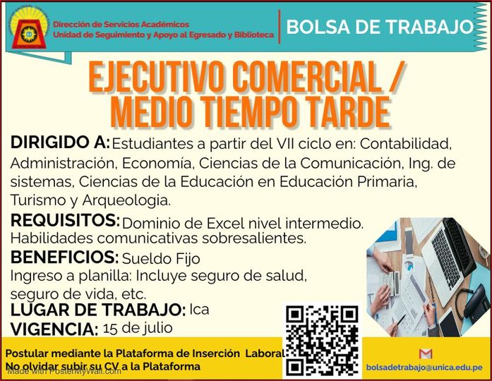 Bolsa de Trabajo | EJECUTIVO COMERCIAL/MEDIO TIEMPO TARDE