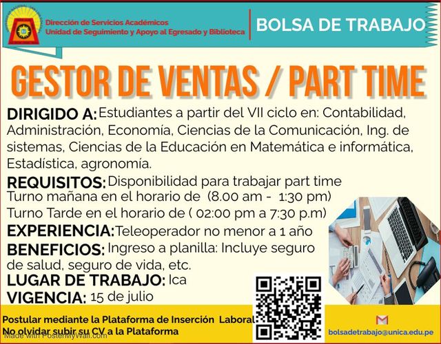 #BolsadeTrabajo | Oferta Laboral Gestor de Ventas/Part Time