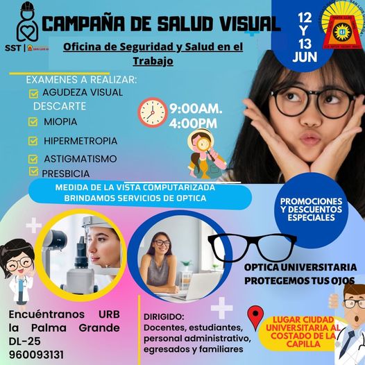 Es grato saludarlos y a la vez remitirles la invitación a la «Campaña de Salud Visual», a realizarse en la Ciudad Universitaria (costado de la capilla), el dia martes 13 de junio desde las 09:00 -16:00 hr.