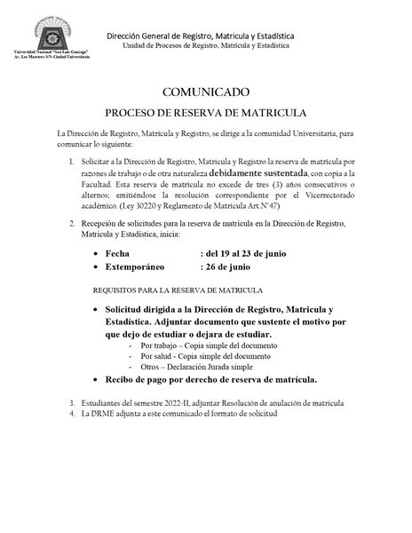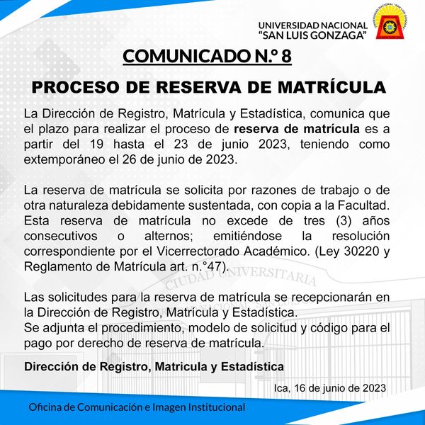 La Dirección de Registro, Matrícula y Estadística, comunica que el plazo para realizar el proceso de reserva de matrícula es a partir del 19 hasta el 23 de junio 2023, teniendo como extemporáneo el 26 de junio de 2023.