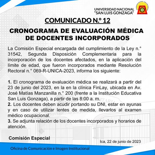 #Comunicado | La Comisión Especial encargada del cumplimiento de la Ley n.° 31542, Segunda Disposición Complementaria para la incorporación de los docentes afectados, en la aplicación del límite de edad, que fueron incorporados mediante Resolución Rectoral n.° 069-R-UNICA-2023, informa los siguiente: