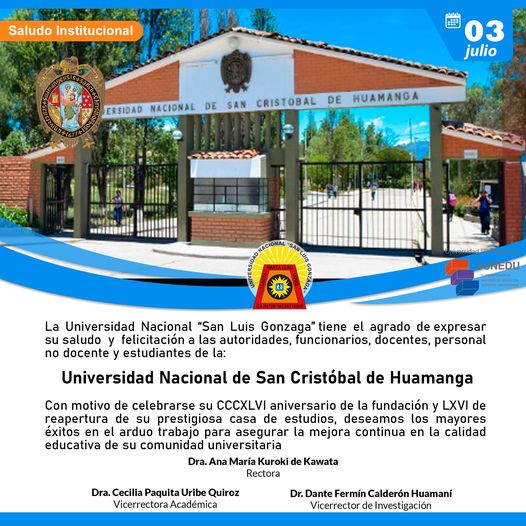 #SaludosInstitucionales | La Universidad Nacional “San Luis Gonzaga” tiene el agrado de expresar su saludo y felicitación a las autoridades, funcionarios, docentes, personal no docente y estudiantes de la Universidad San Cristóbal de Huamanga.