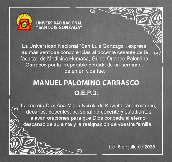 ☦️ CONDOLENCIAS ☦️ | La Universidad Nacional “San Luis Gonzaga”, expresa las más sentidas condolencias al docente cesante de la facultad de Medicina Humana, Guido Orlando Palomino Carrasco por la irreparable pérdida de su hermano,