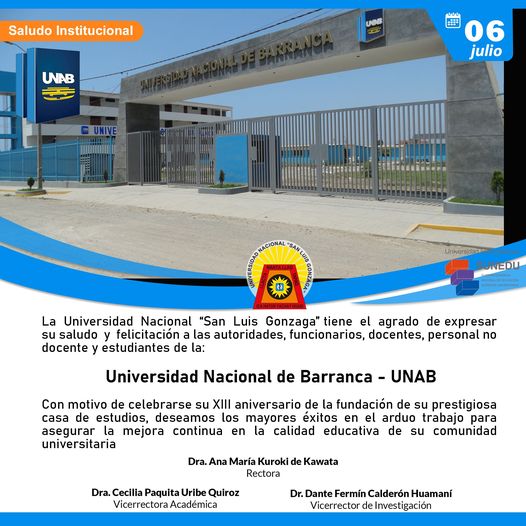 #SaludosInstitucionales | La Universidad Nacional “San Luis Gonzaga” tiene el agrado de expresar su saludo y felicitación a las autoridades, funcionarios, docentes, personal no docente y estudiantes de la Universidad Nacional de Barranca – UNAB