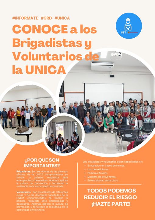 #SST | #InformateYcomparte‼Como parte de nuestro compromiso para fortalecer la gestion del riesgo de desastres en la UNICA contamos con brigadistas y voluntarios para brindar la primera respuesta ante emergencias y desastres. Aplicando la cultura de prevencion y fortaleciendo la resiliencia en la comunidad universitaria.