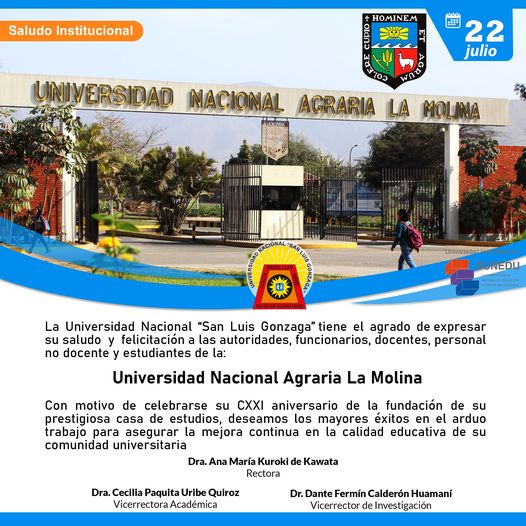 #SaludosInstitucionales | La Universidad Nacional “San Luis Gonzaga” tiene el agrado de expresar su saludo y felicitación a las autoridades, funcionarios, docentes, personal no docente y estudiantes de la Universidad Nacional Agraria la Molina.