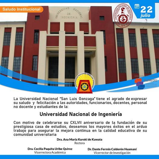 #SaludosInstitucionales | La Universidad Nacional “San Luis Gonzaga” tiene el agrado de expresar su saludo y felicitación a las autoridades, funcionarios, docentes, personal no docente y estudiantes de la Universidad Nacional de Ingeniería.