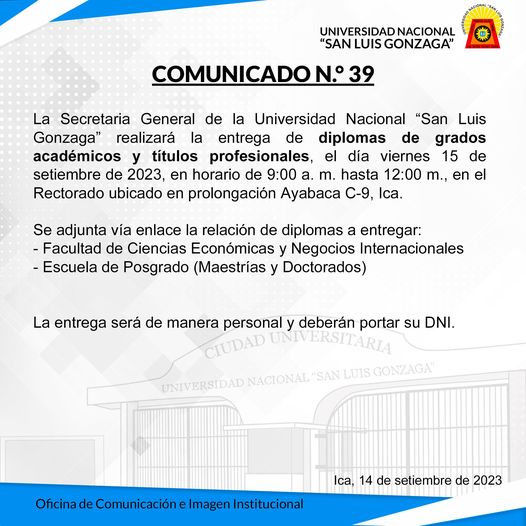 #EntregaDiplomas | La Secretaria General de la Universidad Nacional “San Luis Gonzaga” realizará la entrega de diplomas de grados académicos y títulos profesionales, el día viernes 15 de setiembre de 2023, en horario de 9:00 a. m. hasta 12:00 m., en el Rectorado ubicado en prolongación Ayabaca C-9, Ica.