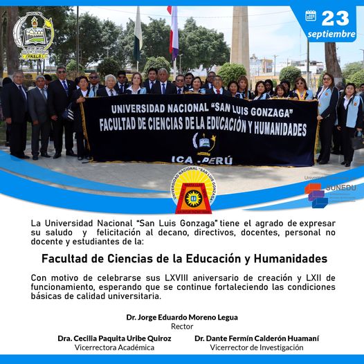 #SaludosInstitucionales | La Universidad Nacional “San Luis Gonzaga” tiene el agrado de expresar su saludo y felicitación al decano, directivos, docentes, personal no docente y estudiantes de la: FACULTAD DE CIENCIAS DE LA EDUCACIÓN Y HUMANIDADES.
