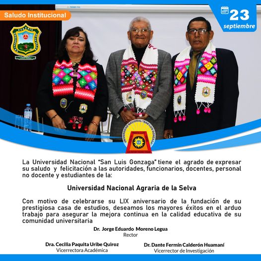 #SaludosInstitucionales | La Universidad Nacional “San Luis Gonzaga” tiene el agrado de expresar su saludo y felicitación a las autoridades, funcionarios, docentes, personal no docente y estudiantes de la UNAS – Universidad Nacional Agraria de la Selva