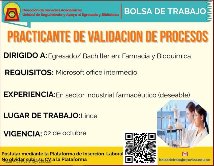 #ofertalaboral | Oferta laboral practicante de validación de procesos