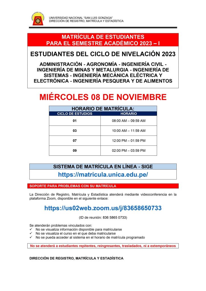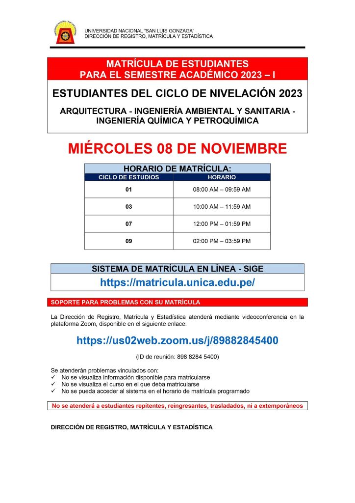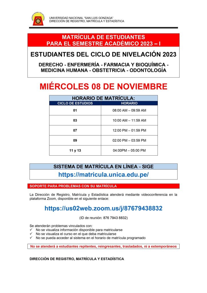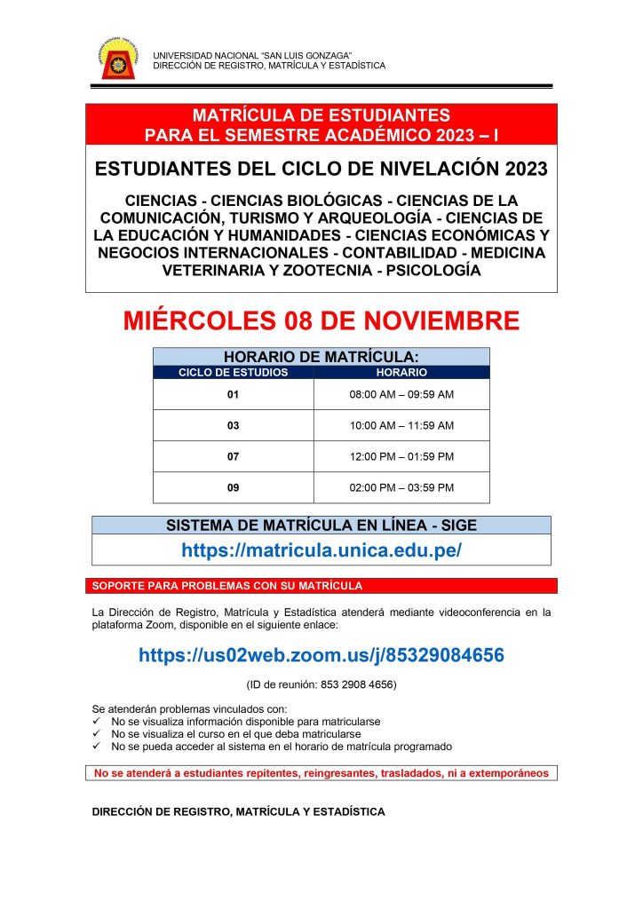 el miércoles 8 de noviembre corresponde la matrícula de los ESTUDIANTES DEL CICLO DE NIVELACIÓN 2023.