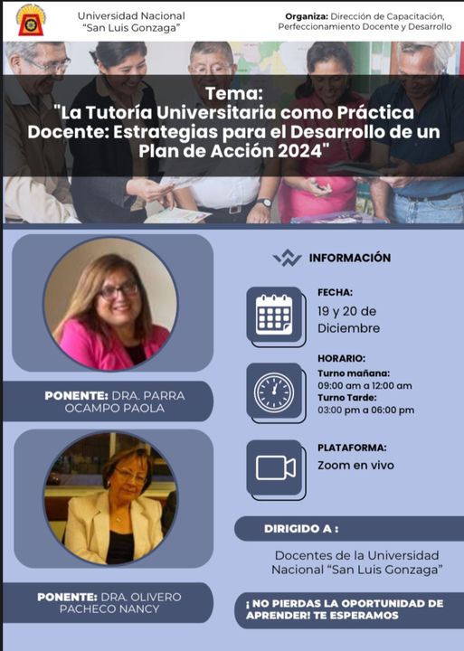 #CapacitaciónDocente | ¡Atención profesores de la Universidad San Luis Gonzaga! ¿Listos para un nuevo reto? La Dirección de Capacitación, Perfeccionamiento Docente y Desarrollo les invita a la capacitación general por área de Ciencias Sociales y Humanidades, área de Ciencia de la Salud, área Ciencias e Ingenierías al imperdible curso «la tutoría universitaria como práctica docente: estrategias para el desarrollo de un plan de acción 2024”. ¡No pierdan la oportunidad de aprender de la mano de la brillante,
