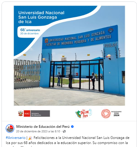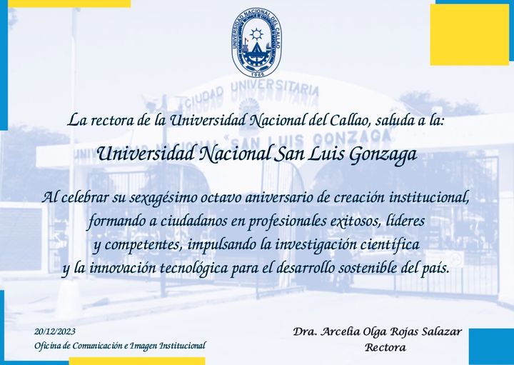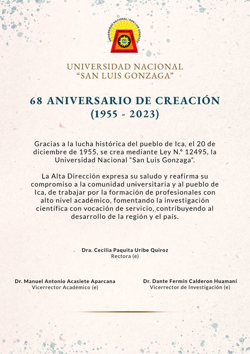La Alta Dirección expresa su saludo y reafirma su compromiso a la comunidad universitaria y al pueblo de Ica, de trabajar por la formación de profesionales con alto nivel académico, fomentando la investigación científica con vocación de servicio, contribuyendo al desarrollo de la región y el país.