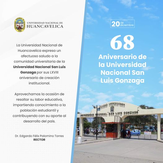 #AniversariodeCreación | Desde su FanPage oficial la Universidad Nacional de Huancavelica mediante su rector Dr. Edgardo Félix Palomino Torres nos envía su saludo por los 68º aniversario de creación institucional.