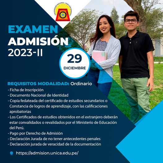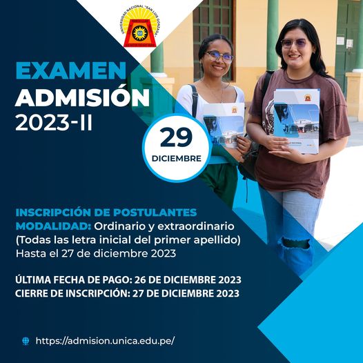#Admision | La Comisión Central de Admisión (CECA), de la Universidad Nacional “San Luis Gonzaga”, informa que las inscripciones para el examen de admisión 2023 II serán para todas las letras todos los días en horarios de 8:00 a.m. a 5:00 p.m. de lunes a viernes y sábados de 8:00 a.m. a 1:00 pm. Se va a atender los feriados excepto el 25 de diciembre de 2023, ultimo día de pago 26 de diciembre.