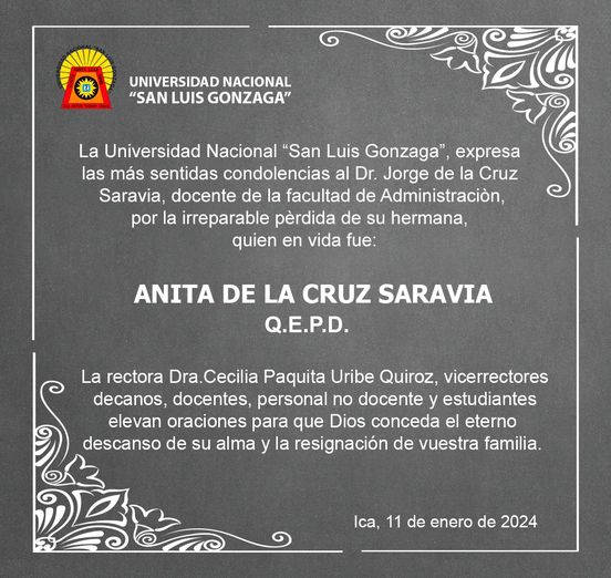☦️ CONDOLENCIAS ☦️ | La Universidad Nacional “San Luis Gonzaga”, expresa las más sentidas condolencias al Dr. Jorge de la Cruz Saravia, docente de la facultad de Administración, por la irreparable pérdida de su hermana, quien en vida fue: