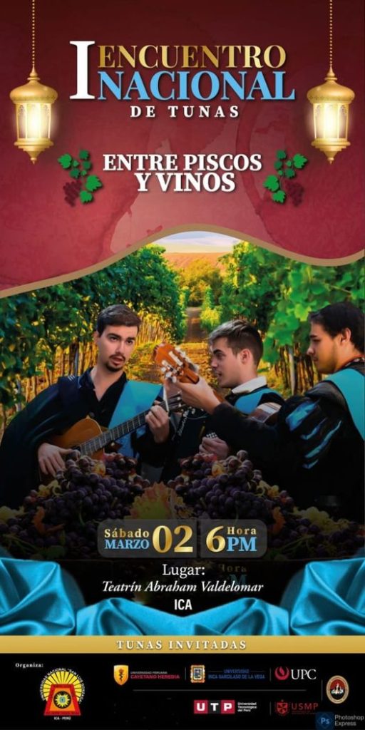 #Tunas | La Dirección de Responsabilidad Social Universitaria, Proyección Social y Extensión Cultural, invita a toda la comunidad universitaria y público en general a participar en el “I ENCUENTRO NACIONAL DE TUNAS DE LA UNICA ENTRE PISCOS Y VINOS”, el cual tiene como anfitrión a la Tuna de la Universidad Nacional «San Luis Gonzaga».