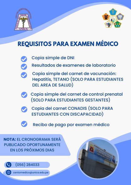 #centromedico | publicación de los requisitos y órdenes auxiliares para el examen médico, con el objetivo de conocer el estado de salud físico y mental de los estudiantes ingresantes,