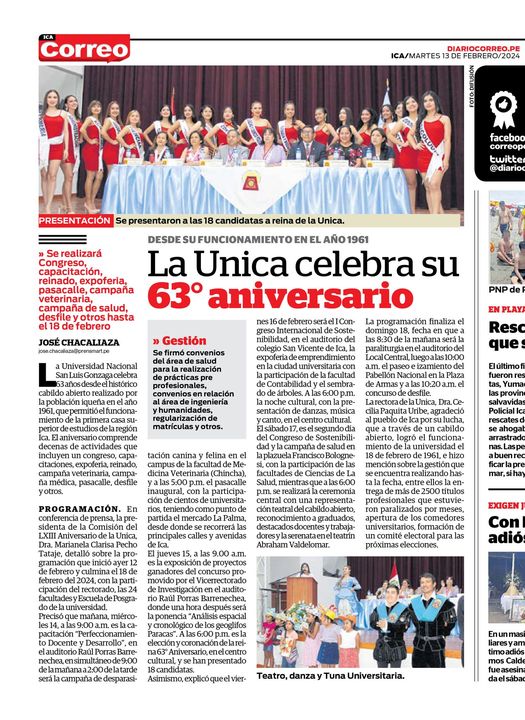 #Difusión | El diario Correo Ica, en su edición del martes 13 de febrero indica: «La Universidad Nacional San Luis Gonzaga celebra 63 años desde el histórico cabildo abierto realizado por la población iqueña en el año 1961, que permitió el funcionamiento