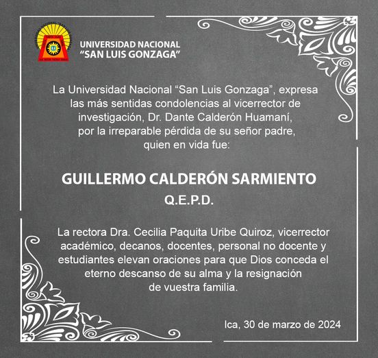 | La Universidad Nacional “San Luis Gonzaga”, expresa las más sentidas condolencias al vicerrector de investigación, Dr. Dante Calderón Huamaní, por la irreparable pérdida de su señor padre, quien en vida fue: Guillermo Calderón Sarmiento.