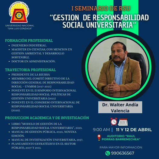 #PrimerSeminariodeRSU | La Dirección de Responsabilidad Social Universitaria, Proyección Social y Extensión Cultural nos presenta al ponente del Primer Seminario de RSU: denominado «Gestión de Responsabilidad Social Universitaria», el Dr. Walter Andia Valencia, actual presidente de la Red Internacional Universitaria de Responsabilidad Social y Ambiental – RIURSA, profesional con gran trayectoria en temas relacionados a la responsabilidad social universitaria.