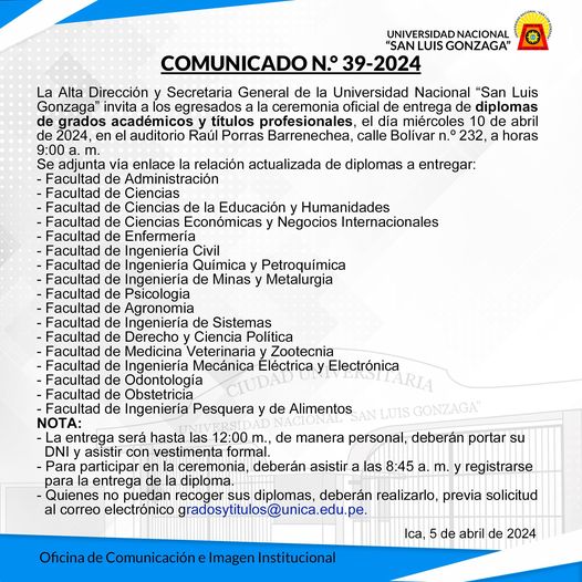 La Alta Dirección y Secretaria General de la Universidad Nacional “San Luis Gonzaga” invita a los egresados a la ceremonia oficial de entrega de diplomas de grados académicos y títulos profesionales, el día miércoles 10 de abril de 2024, en el auditorio Raúl Porras Barrenechea, calle Bolívar n.º 232, a horas 9:00 a. m.