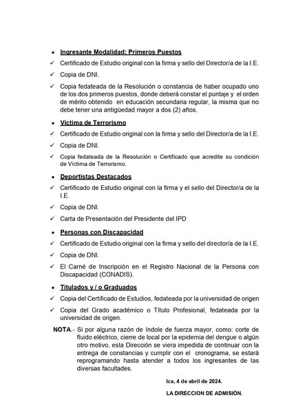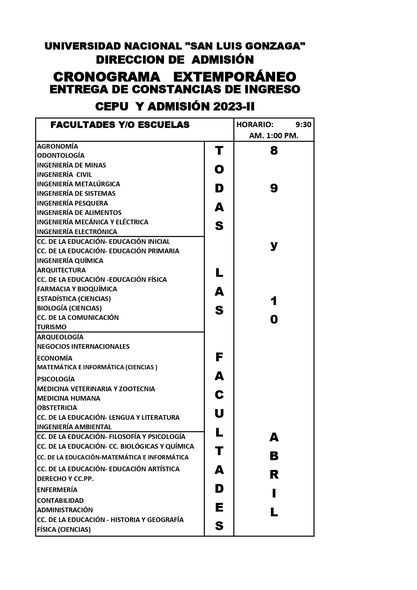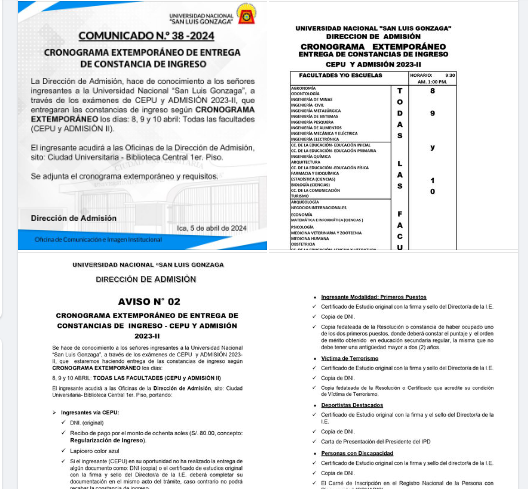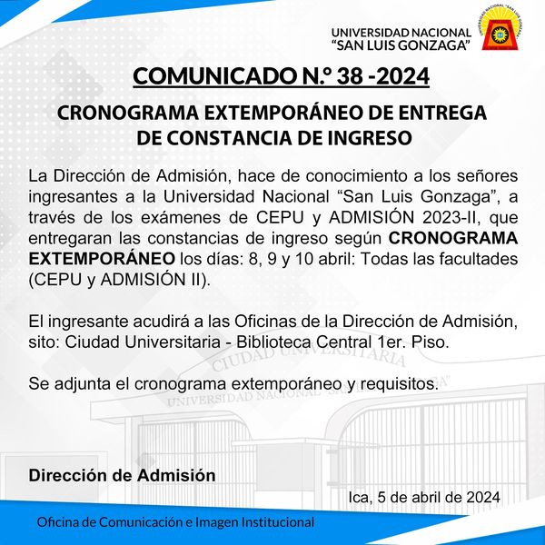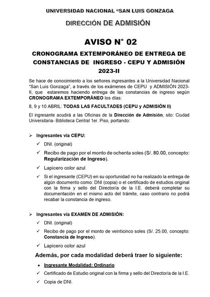 La Dirección de Admisión, hace de conocimiento a los señores ingresantes a la Universidad Nacional “San Luis Gonzaga”, a través de los exámenes de CEPU y ADMISIÓN 2023-II, que entregaran las constancias de ingreso según CRONOGRAMA EXTEMPORÁNEO los días: 8, 9 y 10 abril: Todas las facultades (CEPU y ADMISIÓN II).