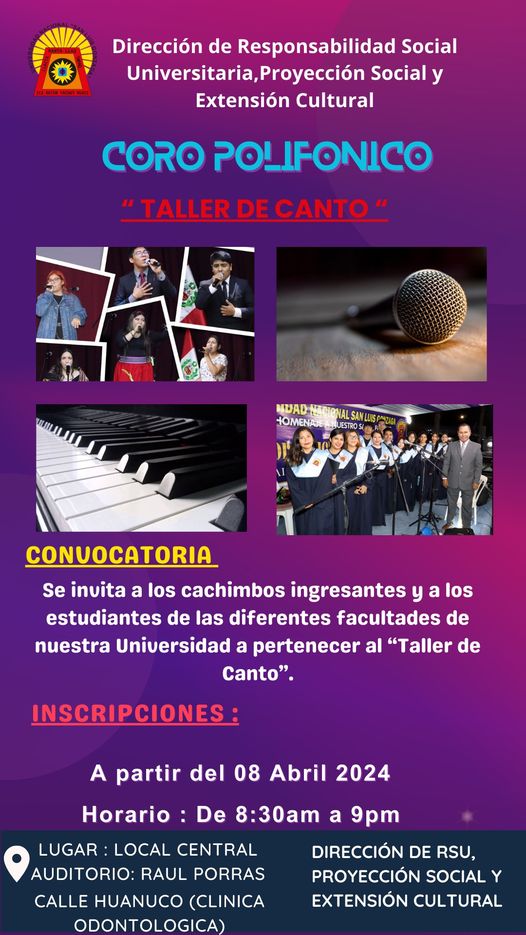 La Dirección de Responsabilidad Social Universitaria, Proyección Social y Extensión Cultural invita a los estudiantes de la Universidad Nacional «San Luis Gonzaga» a participar en el Taller de Canto y Coro Polifónico.