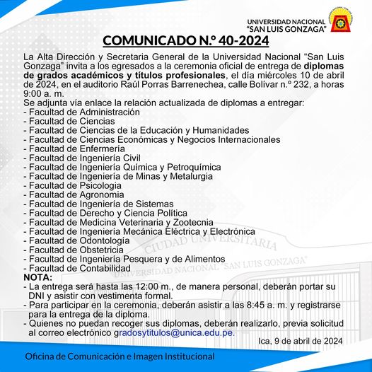 La Alta Dirección y Secretaria General de la Universidad Nacional “San Luis Gonzaga” invita a los egresados a la ceremonia oficial de entrega de diplomas de grados académicos y títulos profesionales, el día miércoles 10 de abril de 2024, en el auditorio Raúl Porras Barrenechea, calle Bolívar n.º 232, a horas 9:00 a. m.