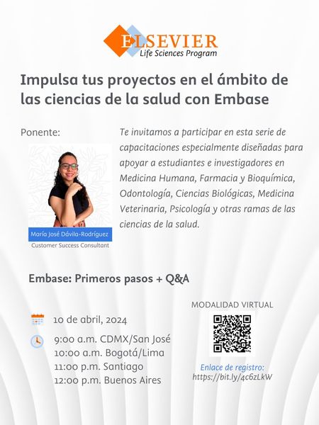 Embase, te invitamos a participar en esta serie de capacitaciones especialmente diseñadas para apoyar a estudiantes e investigadores en Medicina Humana, Farmacia y Bioquímica, Odontología, Ciencias Biológicas, Medicina Veterinaria, Psicología y otras ramas de las ciencias de la salud.