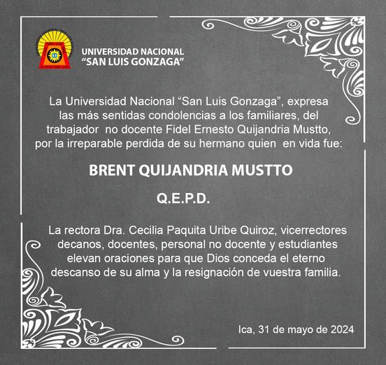 La Universidad Nacional “San Luis Gonzaga”, expresa las más sentidas condolencias a los familiares, del trabajador no docente Fidel Ernesto Quijandria Mustto, por la irreparable perdida de su hermano quien en vida fue: BRENT QUIJANDRIA MUSTTO, Q.E.P.D.